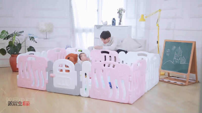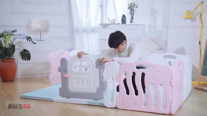 兒童圍欄一般由門欄,游戲欄和圍欄單片組成,他們之間用卡槽式插口進行連接,穩(wěn)固主要以4面拼接來完成,同時通過底部吸盤來輔助防滑。短視頻制作